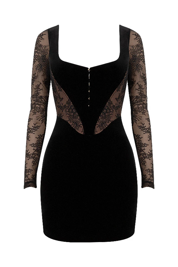 This luxurious deep plush velvet and delicately embroidered lace creation is our ‚Elena‘ dress in a seductive black tone. Be sure to turn heads this season with its flattering sweeping balconette cut for the perfect volumising uplift to keep the bust sitting pretty for the ultimate cleavage. The bodice features our special boning to the front, sides and back to ensure the utmost support and figure cinching properties, it is fully lined in a textured fabric for a non slip effect. We love the pretty lace arms that are gathered at the seam for a super slim fit and the dipped waistline to compliment the soft velvet close fitting skirt in a flattering mini cut. The skirt is fully lined in a stretch satin for a smooth and seam free finish. It has a zip to the back for easy on. Wear yours with a slim heel such as our ‚Paris‘ in black for a top to toe tonal vibe.