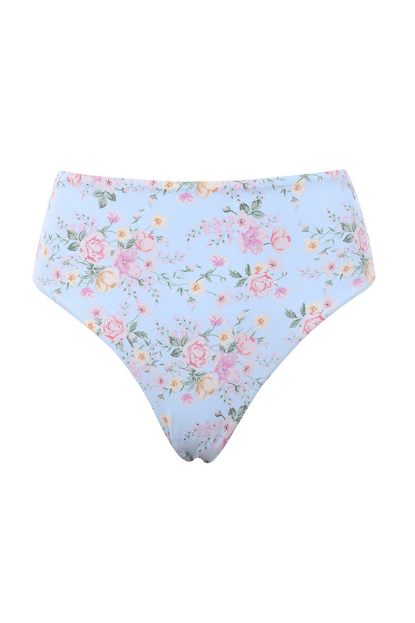 So fresh and pretty, ‚Perdita‘ is one of our favourite swim sets this Summer. It’s cut from a shirred stretch fabric with a delicate blue floral print. The simple top is ultra flattering and has halter straps that tie behind the neck. The briefs are cut to sit high at the waist with a slightly retro feel and ofer full coverage to the booty area. Wear yours with a crisp white over-shirt and sunnies at the beach and with denim cut offs away from the poolside.