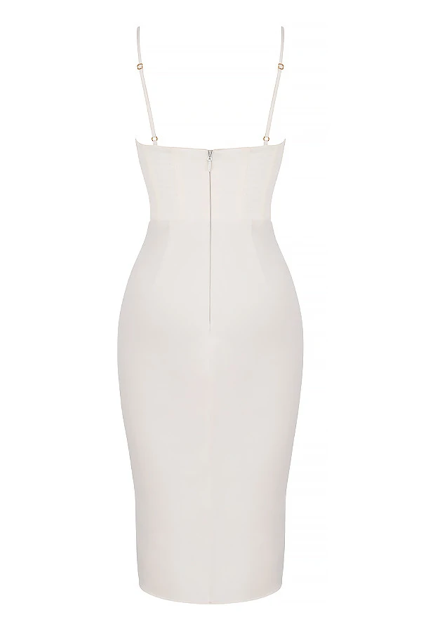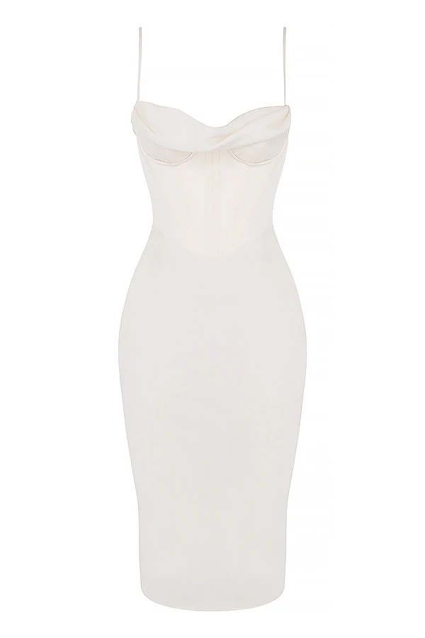 Delicate and dainty, HouseofCB updates the timeless slip dress with a beautifully draped cowl neckline. ‚Myrna‘ is made from our lustrous silk satin in ani ivory tone and is cut on the bias for a beautiful drape and figure skimming silhouette. The bodice features our incredible corsetry boning to really cinch the figure in and is fully lined in a textured fabric for a non slip hold.