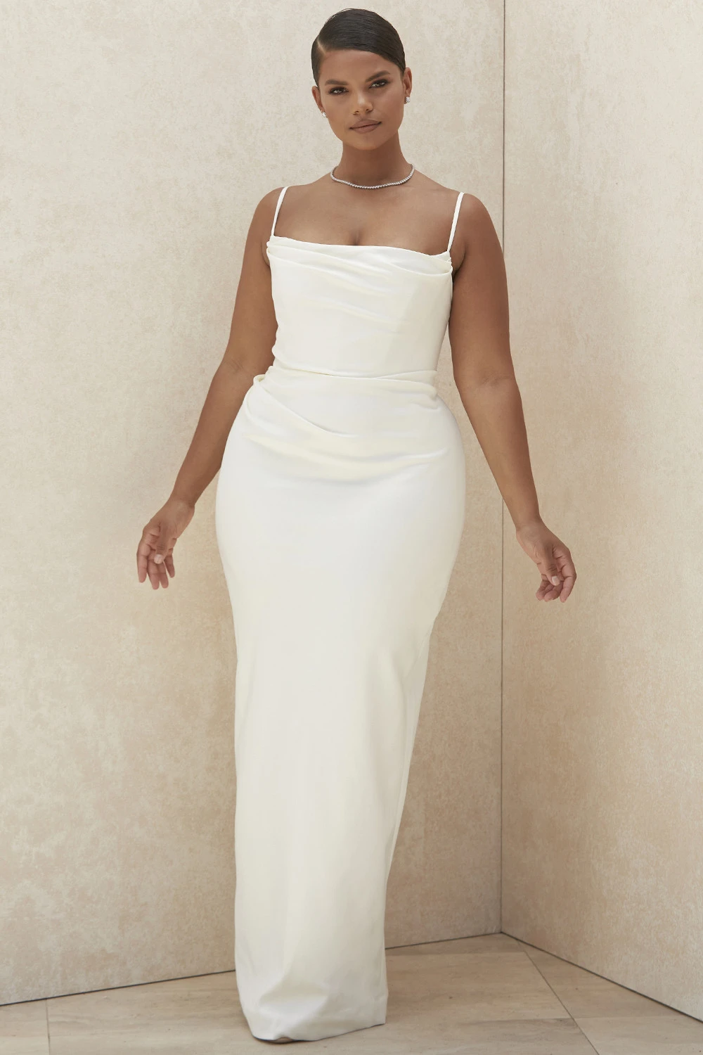 This beautiful gown puts the focus firmly on elegant draping to craft an exquisite silhouette. The neckline, slender straps and clever hip draping come together to create this simple yet showstopping gown that’s all underpinned with expert corsetry to the lining layer. The sheath skirt grazes the floor and the back vent allows for ease of movement