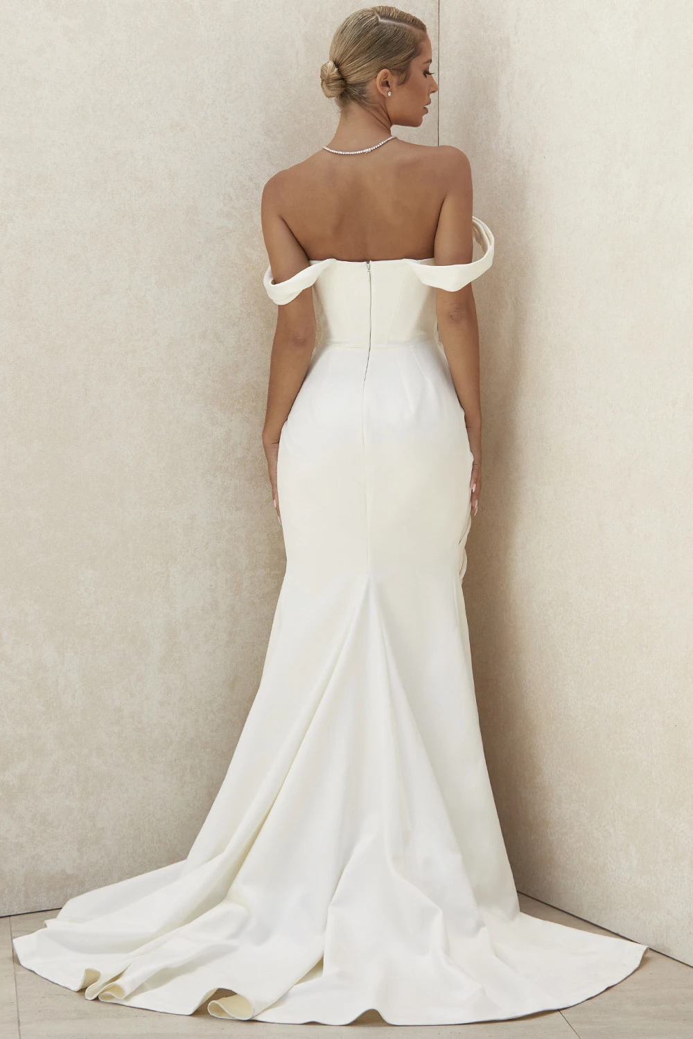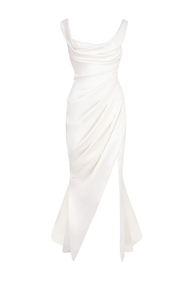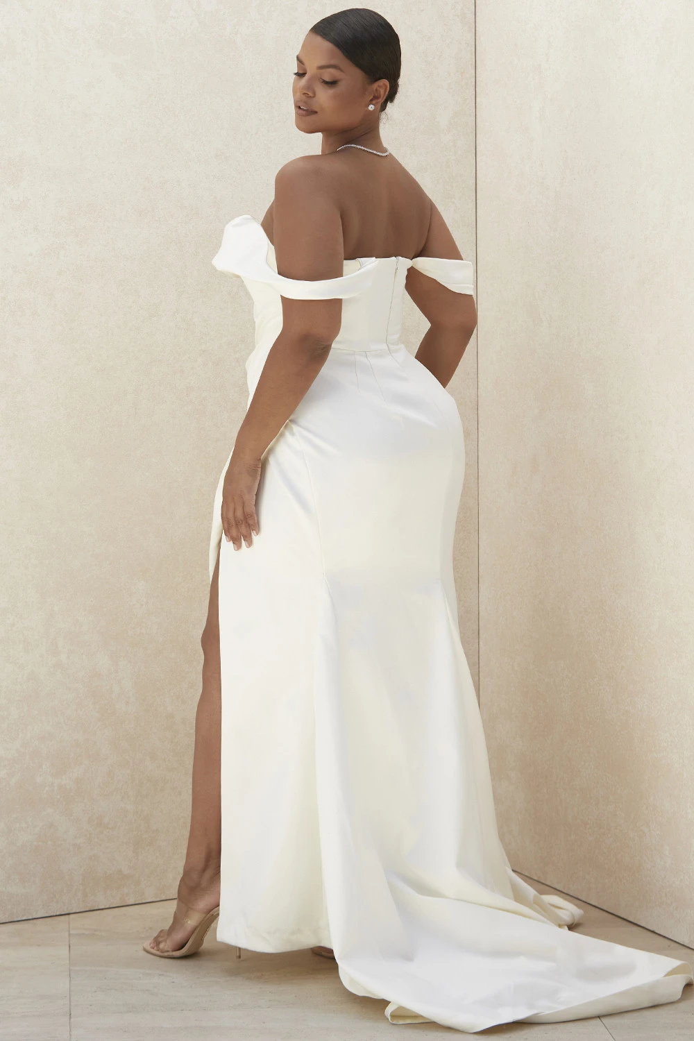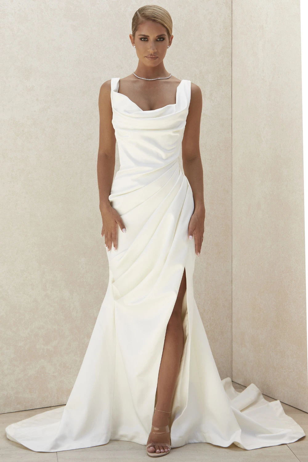 The most spectacular gown in our Debut collection, ‚Delphine‘ is expertly crafted from our lustrous weighty Duchesse satin. It features incredible corsetry and draping to give second-to-none cinching and lift. The draped satin extends languidly from the bust around the shoulders to form sexy sleeves that can sit off shoulder or on or do like our designer intended with just one sitting sexily off shoulder. The clever draping extends down through the bodice and creates the most perfect hourglass silhouette. The leg baring front slit is super sexy as you walk down the aisle and Delphine finishes in a long langorous sweeping train for extra drama. Wear yours with the prettiest shoes to highlight your legs in this thigh slit style.