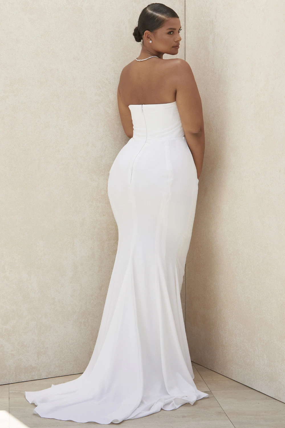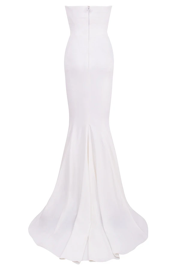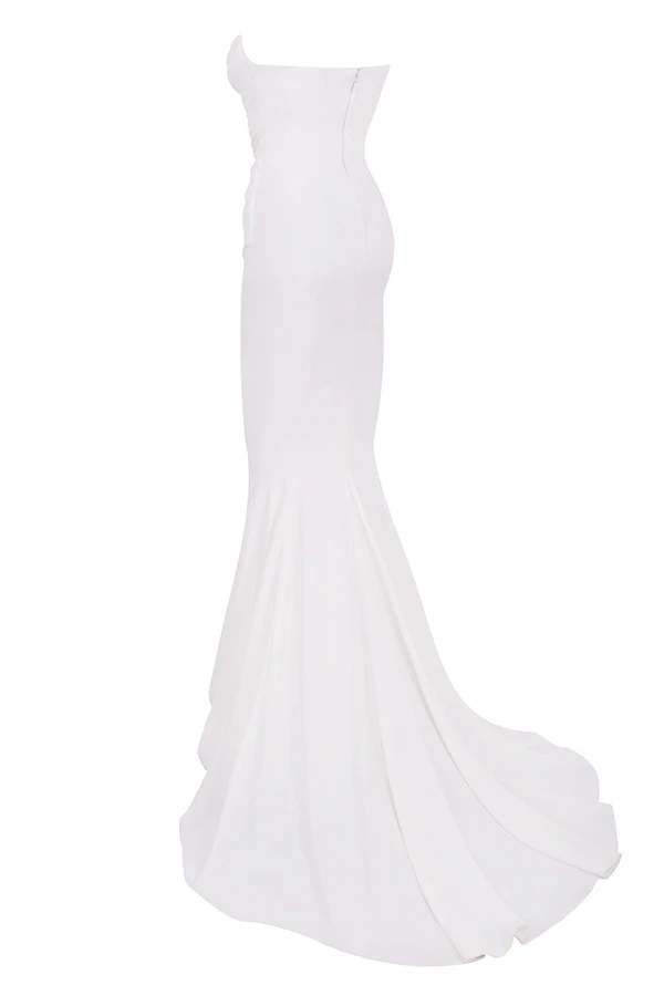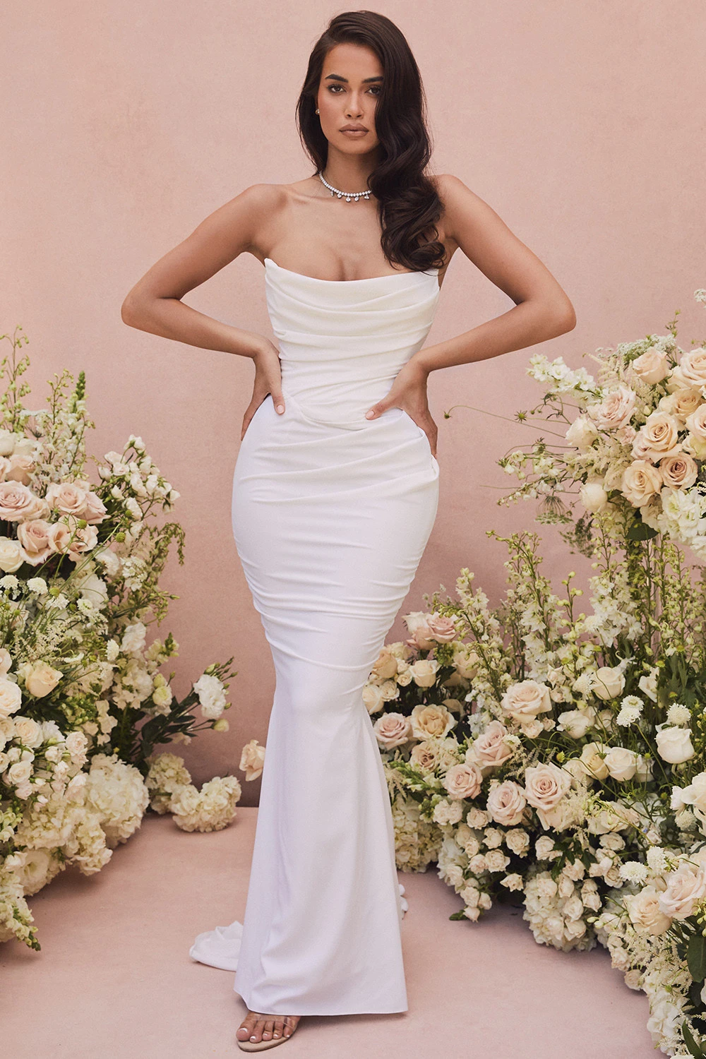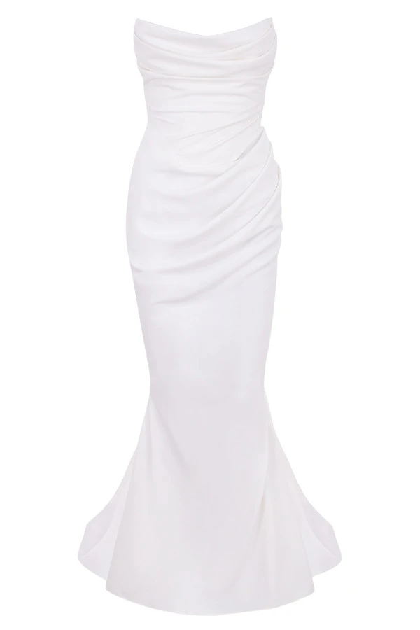 The elegant draping of ‚Esmee‘ is truly a masterpiece. It’s made from a lustrous smooth satin that’s draped around a fully corseted bodice for the ultimate in cinching and support. The structured sweetheart neckline is ultra flattering and the inner layers are corseted to the hilt for maximum support and lift. The beautifully draped skirt falls away to a sweep train to add further drama to your entrance. Add delicate sandals in White like our ‚Marivel‘ and a dainty veil.