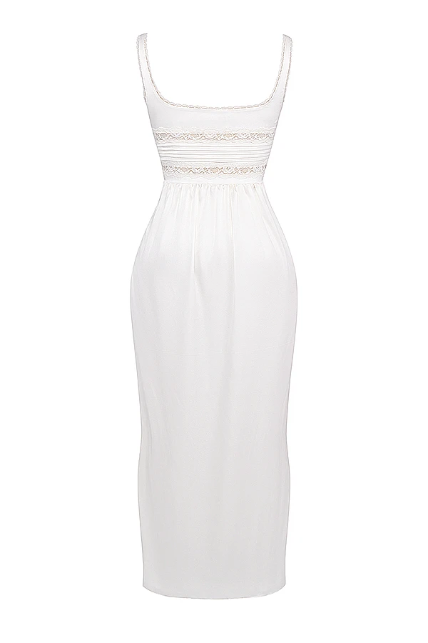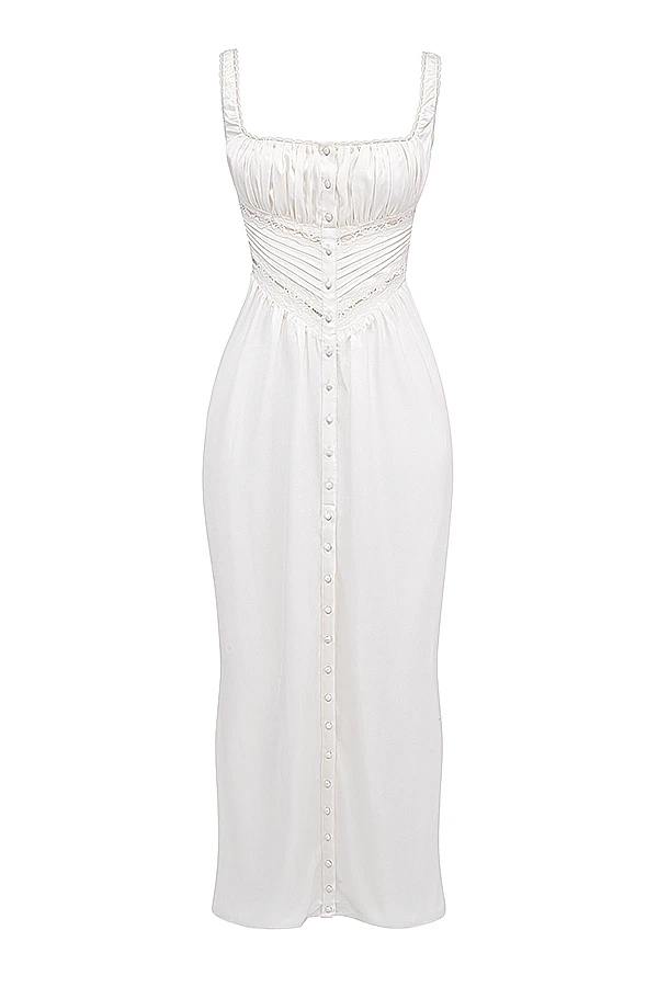 ‚Illiana‘ is softly gathered at the waist and the bias cut falls to a flattering ankle length with a button front and zips up the left side for easy on. It’s fully lined for a smooth finish and ‚Illiana‘ is perfect for late Spring and early Summer dates and we love the modern bride vibes for beach weddings. Wear yours with our ‚Lucent‘ mules.