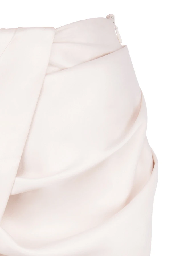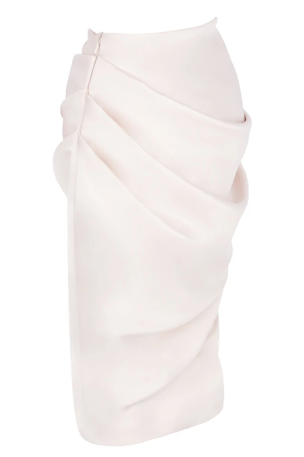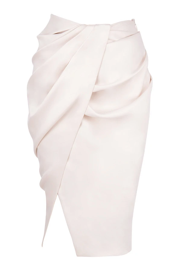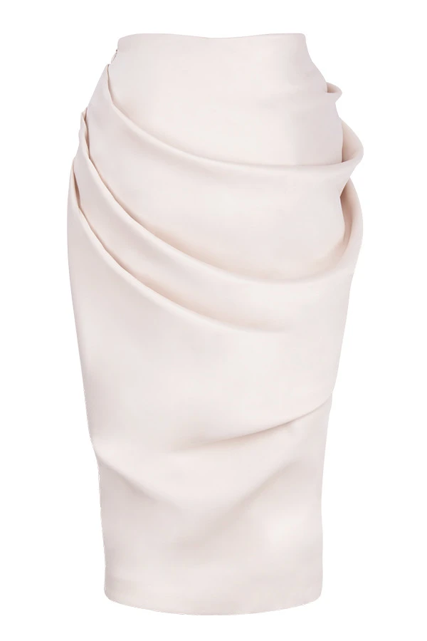 ‚Annabelle‘ is cut from our ultra luxe and lustrous duchess satin for a super luxurious vibe and has an elegant midi cut. Our second-to-none tailoring team has put the focus right on your hips and butt with clever draping to enhance your curves and all the while ensuring that ‚Annabelle‘ won’t pool or loose its shape as you sit. The waist sits on your natural waistline with a gentle waterfall drape to the front and the skirt falls away to a split at the hem for just the barest flash of skin. It’s fully lined, as are most HOCB items, for the smoothest, most comfortable fit. It fastens to the side with a zipper. ‚Silva‘ top not included.