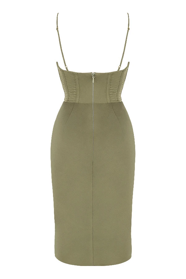 Delicate and dainty, HouseofCB updates the timeless slip dress with a beautifully draped cowl neckline. ‚Myrna‘ is made from our lustrous silk satin in a soft olive tone and is cut on the bias for a beautiful drape and figure skimming silhouette. The bodice features our incredible corsetry boning to really cinch the figure in and is fully lined in a textured fabric for a non slip hold.