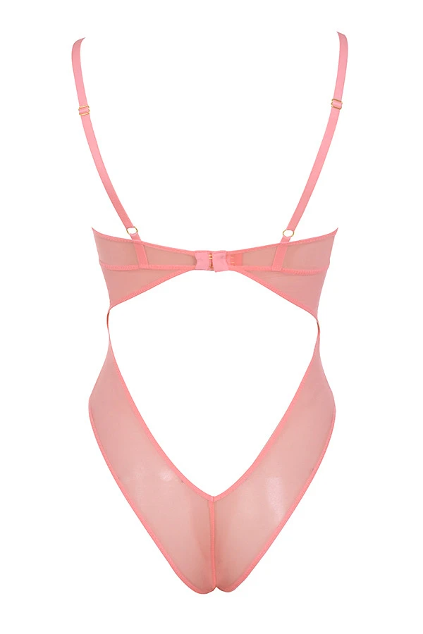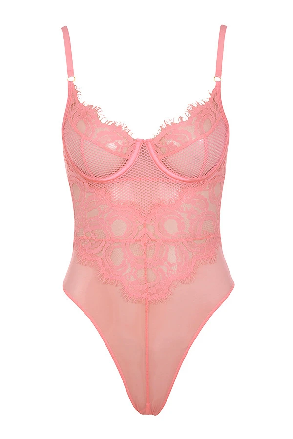 This gorgeous lace bodysuit combines feminine lace and a keyhole back. Crafted from pink lace and fishnet, ‚Nadia‘ has a cupped bust with mesh and lace to the front and back. The adjustable straps make for a perfect fit and the adjustable keyhole back is pretty and sexy. The cups are mesh with a layer of lace over. We’d suggest using our second skin silicon nipple covers underneath if you prefer more coverage. Wear yours as outerwear with jeans or a pencil skirt.