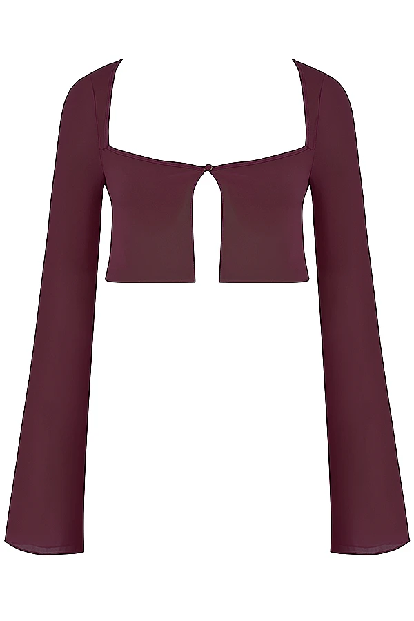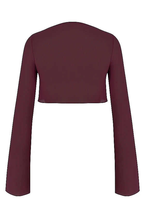 Our ‚Marseille‘ cropped top is simple yet sexy and perfect for slipping on over your swimwear after a day at the beach. Cut from our semi sheer georgette fabric in a pretty prune hue, it features a single button front fastening with a curved neckline and has slightly flared cuffs that graze the knuckles. We love this teamed with the matching ‚Amalfi‘ skirt in prune as our designers intended.