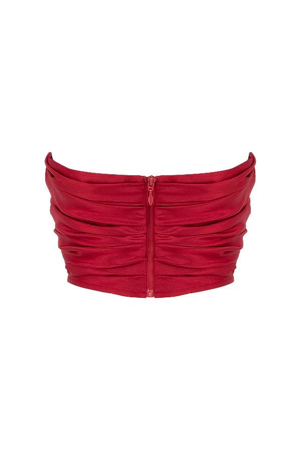 Cut from our light and ultra chic taffeta fabric, ‚Ari‘ is simply delightful. It is designed in a deep red tone and is oh so versatile to wear all season. It has a cup-free balconette style boned corset construction that creates an amazing supportive hold for the bust. It’s boned to the front, back and sides and lined with a textured crepe to ensure that non slip finish we all want from a strapless corset.
