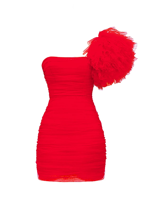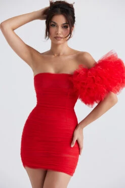 Channeling modern glamour, ‚Noelle‘ is the perfect dress for the party season. It’s defined by the most dramatic ruffle ball sleeve to one shoulder that can be worn up or down, depending on your mood. It’s cut from stretch tulle in a vibrant scarlet hue and features our signature boning to the bodice to cinch the waist. It zips up the back for easy on and looks the most chic styled with our ‚Paris‘ heels in scarlet for a top to toe tonal vibe.