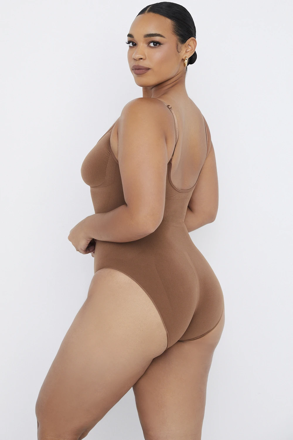 Our bodysuit is made from a seamless stretch knit that’s engineered with a higher tension at the waist to really snatch the waist and shape your figure in a tight fitting yet comfortable fit. This seamless style creates a smooth finish and has a full brief base with are soft edge finished to prevent digging in. The shaped cups give full support. Our signature logo embossed straps are adjustable for the perfect fit. It pulls on for easy wear.