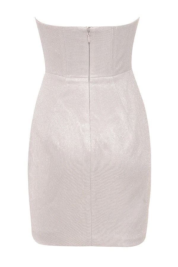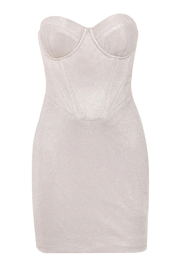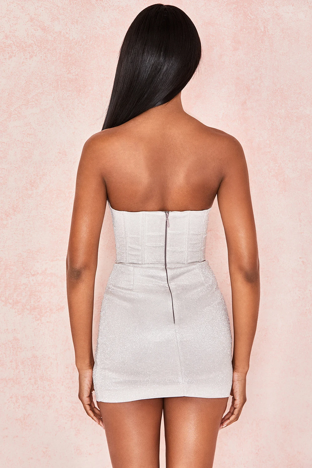 Cut from a glorious sparkly fabric, ‚Eevi‘ has a strapless cut, corseted fit and shorter length. The proper corsetry pushes up the bust and cinches the waist and the stretch sparkly fabric catches the light beautifully. Fully lined fo course, to our usual standards for a smooth and comfortable fit. Wear yours with tonal shoes.