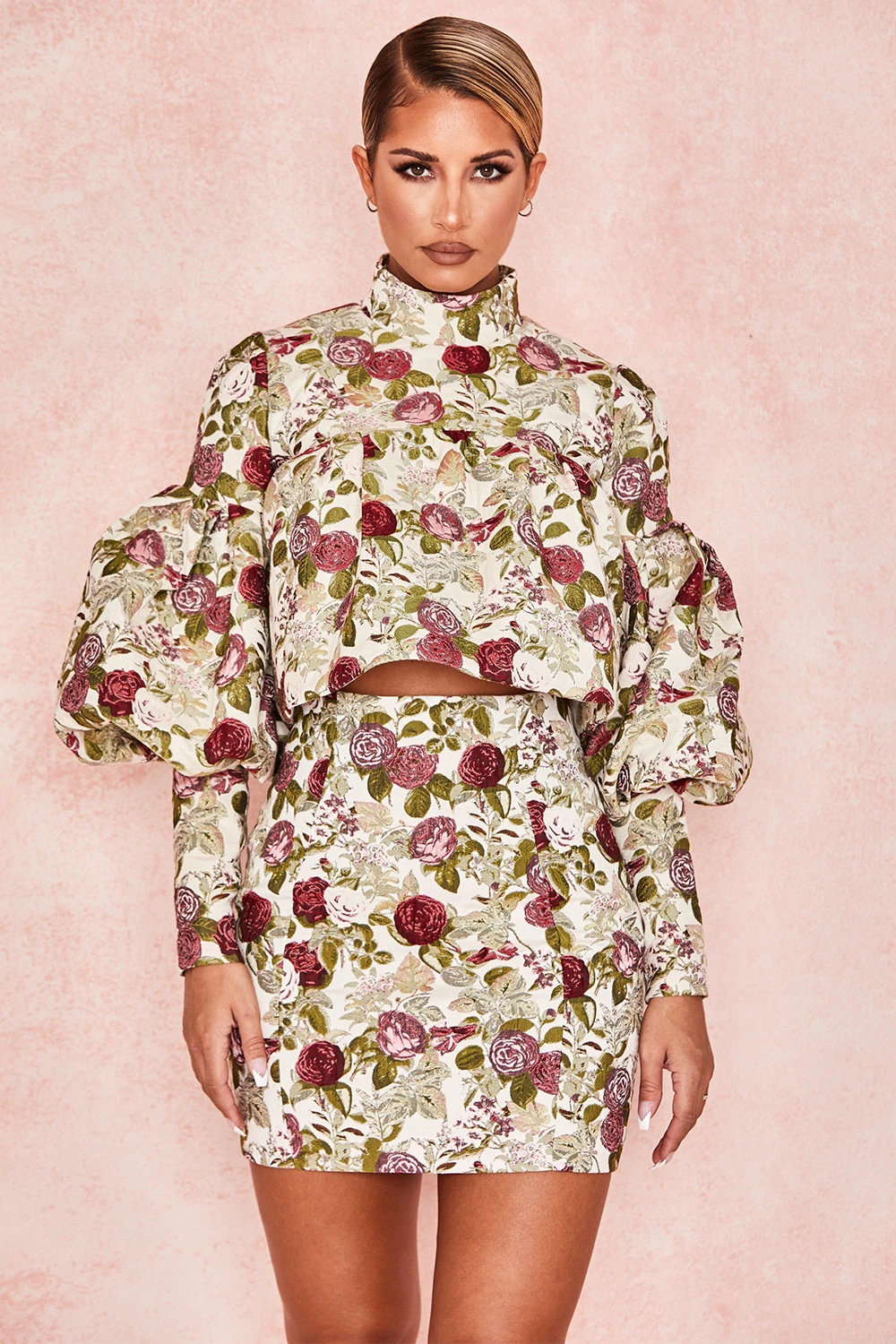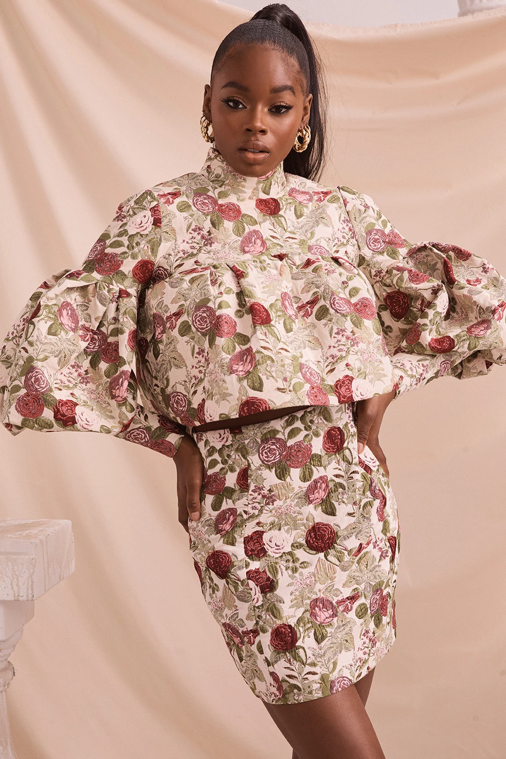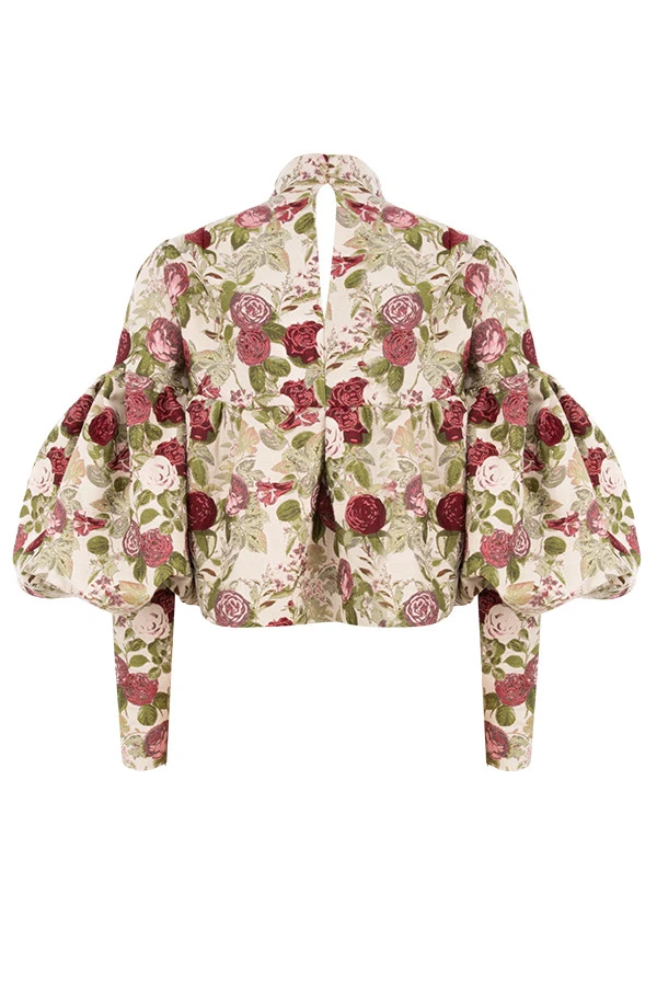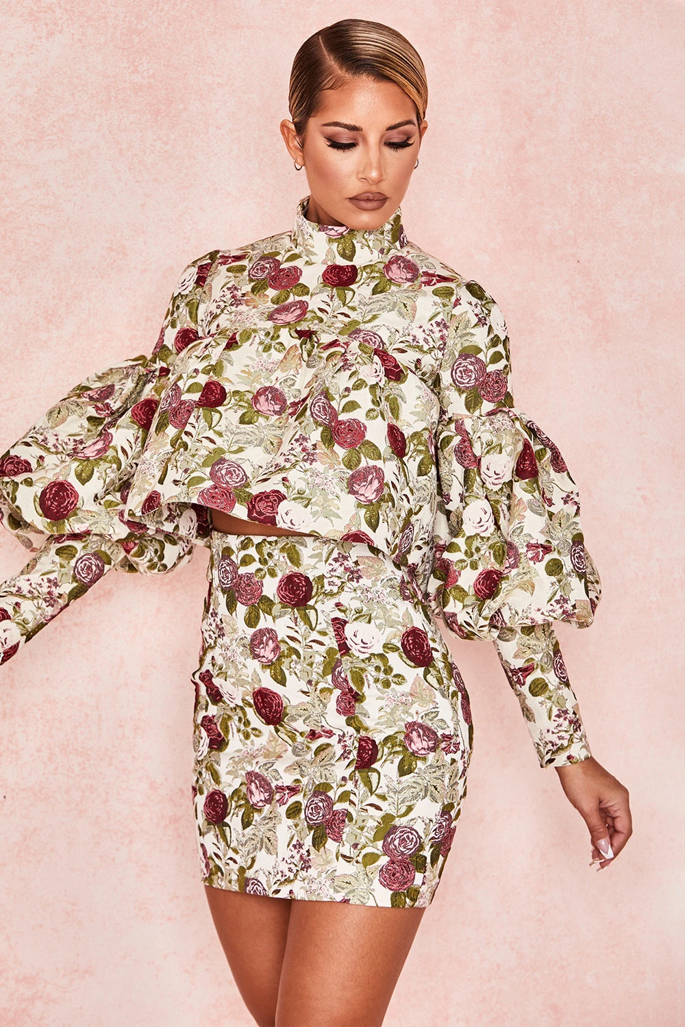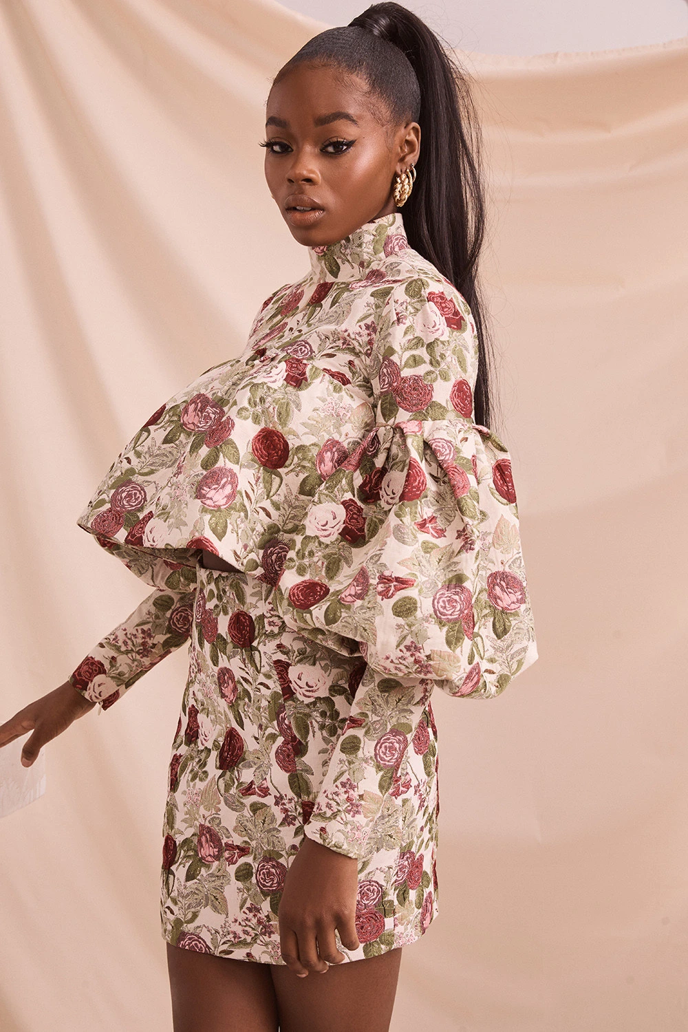 Ultra luxurious top made from our special floral jacquard fabric. This heavyweight floral jacquard fabric is designed and made especially for House of CB. It’s crafted especially for us and you won’t find it anywhere else. ‚Naeve‘ is a perfect glam and luxurious top for when you’d rather not wear a dress. It has a high neck cut with voluminous sleeves that narrow to the wrist and a lovely ruffle shape that’s super pretty and works well with bigger or smaller boobs. It has a keyhole cut to the back and is lined with stretch satin for a smooth comfortable fit.