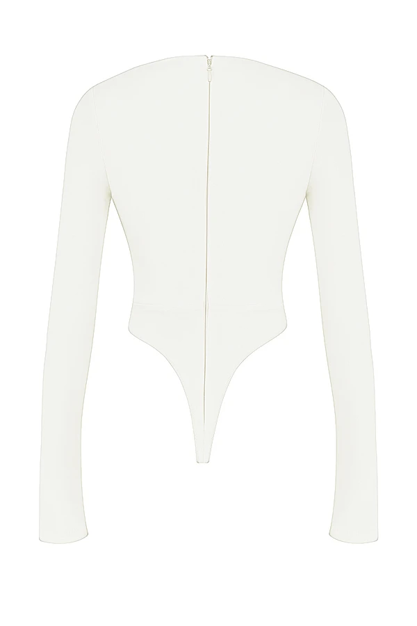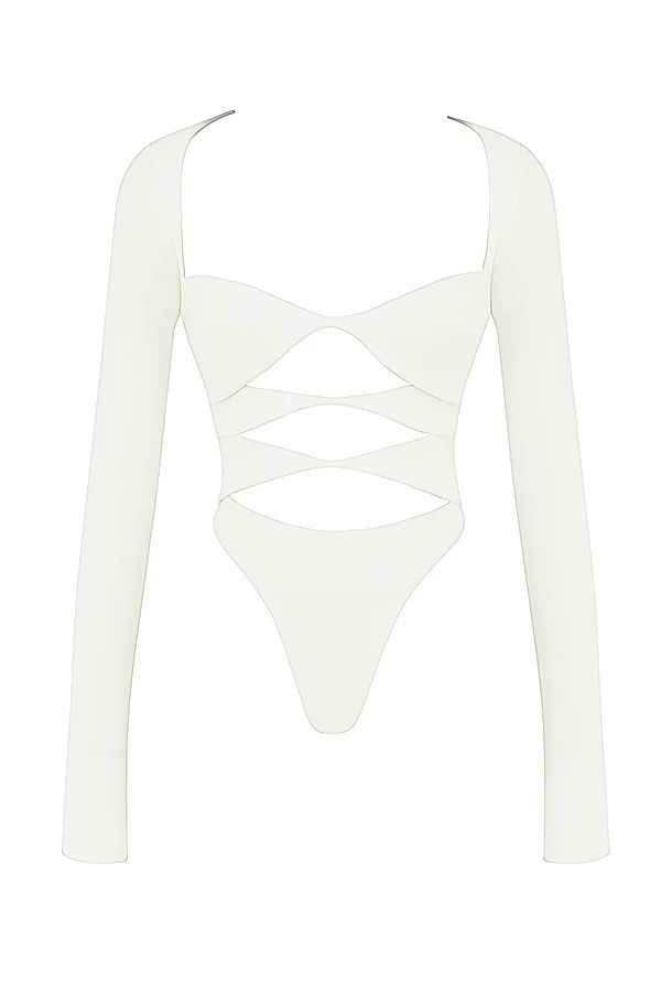‚Danica‘ is designed in a figure hugging silhouette with a trio of cutouts to the front for a sexy, daring take on the classic bodysuit. Cut from a stretch crepe in delicate white, ‚Danica‘ features a pretty sweetheart neckline and the long sleeves rest gently on the shoulders as they frame the décolletage. The brief part has an undetectable thong base and we love this tucked into denim like our ‚Yara‘ vintage fit jeans.