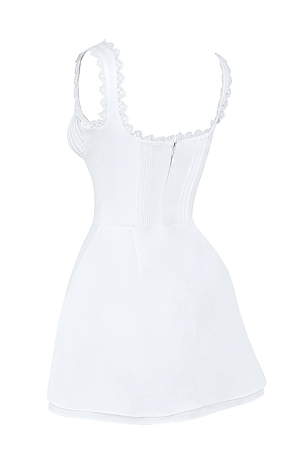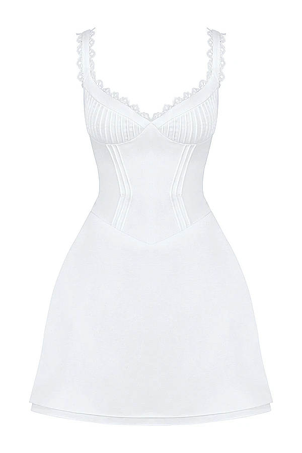 ‚Tilly‘ is crisp, feminine and super Summery. Perfect for those Summer dates, we love the pintucked cups and the corset bodice that cinches the waist. Bronzed legs are highlighted with the flirty hemline. It is fully lined for comfort and has a zip to the back for easy on. Wear yours with our ‚Lola‘ high heels in white on sunny days. The ‚Regular Cup‘ option suits cup size A-C whilst the ‚Bigger Cup‘ option suits cup size D-E.