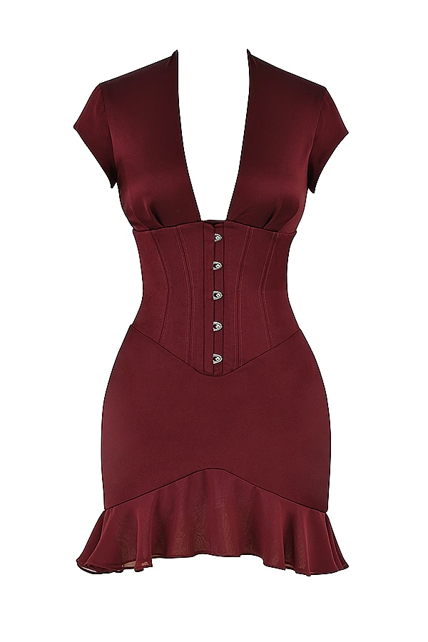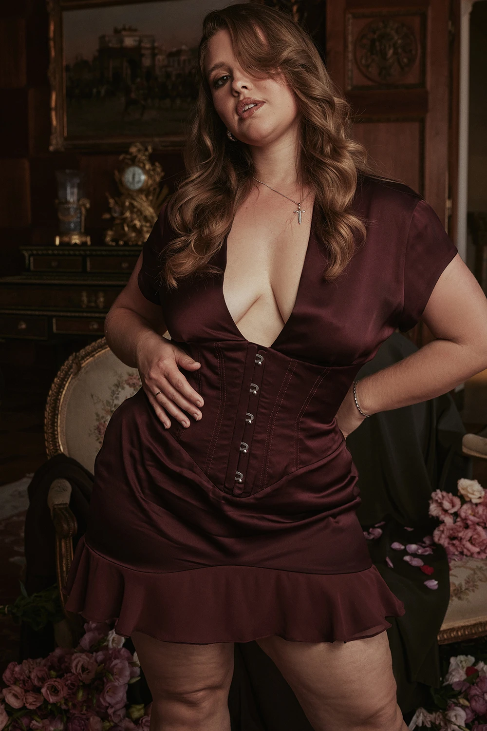 ‚Tianna‘ is one of our most flattering dresses this season. Cut from sumptuously smooth silk satin and floaty georgette in a deep wine hue makes ‚Tianna‘ an autumnal favourite. It features a shawl collar with an open neckline and our incredible boning to the bodice complete with corset hooks for a snatching fit to the waist. The underbust seams define the shape.